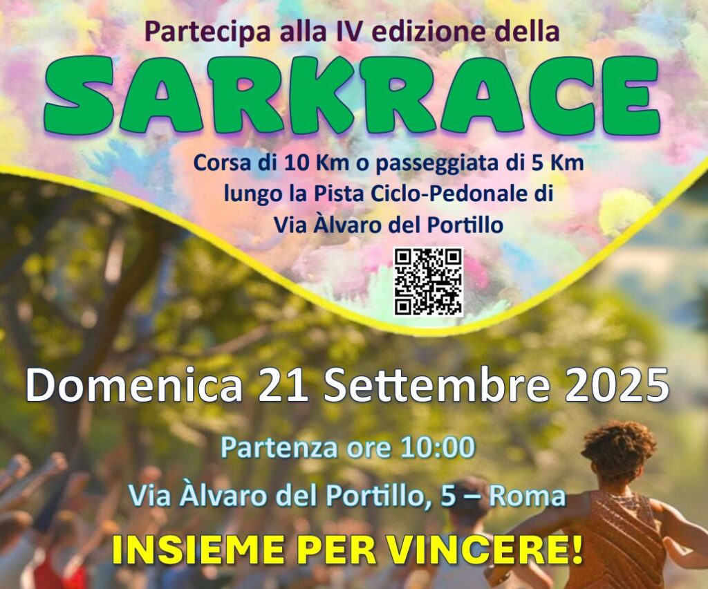 La solidarietà corre veloce alla IV edizione della Sarkrace, l’evento sportivo organizzato dall’Associazione Sarknos per sostenere la ricerca sui sarcomi dei tessuti molli. L’appuntamento è per domenica 21 settembre 2025, lungo la pista ciclo-pedonale di Via Álvaro del Portillo, 5 a Roma, con partenza alle ore 10.